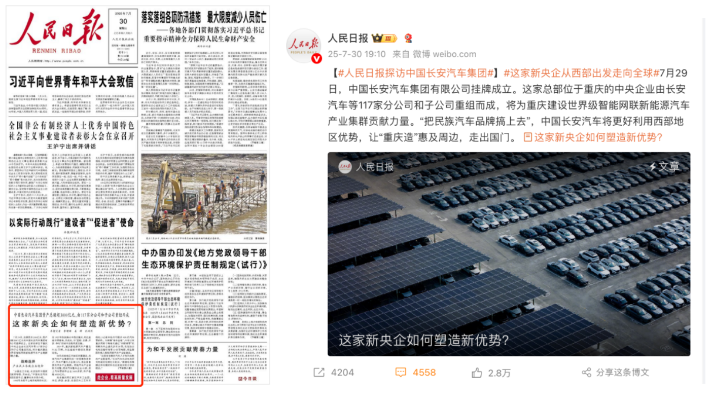 随着今年长安进入全新发展阶段,中央广播电视总台与人民日报社纷纷对新长安的战略布局与创新实践给予高度关注与持续报道:新央企成立当日,央视《新闻联播》进行报道,指出新集团将“以绿色低碳智能产品激发国内需求,加快提升全球资源配置能力和国际影响力”。同时《人民日报》头版刊发《这家新央企如何塑造新优势?》专题报道,深度剖析了中国长安汽车在新能源、智能化、全球化的三大战略支点。