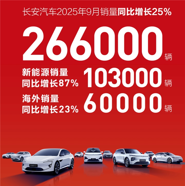刚刚过去的9月,长安汽车三箭齐发,市场表现也格外亮眼。9月整体销量26.6万辆,同比增长25%。尤其是新能源板块,单月销量突破10万辆大关,达到10.3万辆,同比劲增87%,创下历史新高。此外,海外市场也展现出强劲增长态势,9月海外销量6万辆,同比增长23%,以扎实稳健的全球化步伐,逐步提升中国汽车品牌的全球影响力。