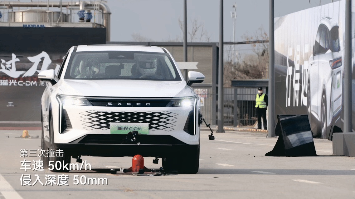 事实上,瑶光C-DM不但无惧内外高温的炙烤,在上述测试中表现优异,同时应对外部剧烈撞击也能游刃有余。早在2024年3月上市时,瑶光C-DM就在全网见证下经历了“过刀山”底盘刮底试验,试验车以30km/h、 40km/h、50km/h的速度连续撞击与电池存在30mm、40mm、50mm侵入(重叠)量的三根车底障碍物,撞击后静置30分钟,瑶光C-DM依然能做到“不冒烟、不漏液、无明火”。