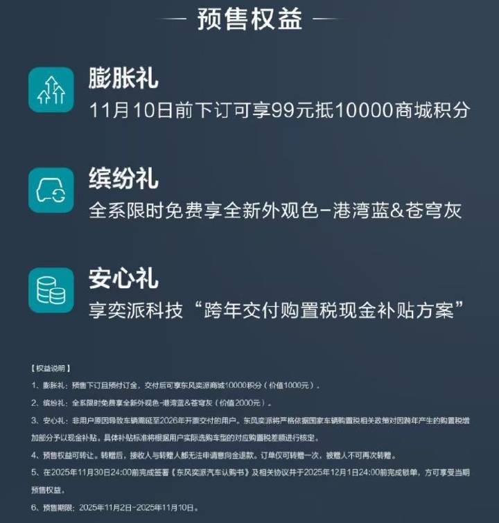 11月2日,东风奕派新款车型eπ007+正式开启预售,共推出3款车型,涵盖增程及纯电双动力,预售价14.99万元起。在11月2日-11月10日期间下订,用户更可享受三重预售权益——“膨胀礼”99元抵10000商城积分、“缤纷礼”全系限时免费享全新外观色-港湾蓝&苍穹灰,以及“安心礼”奕派科技“跨年交付购置税现金补贴方案”。