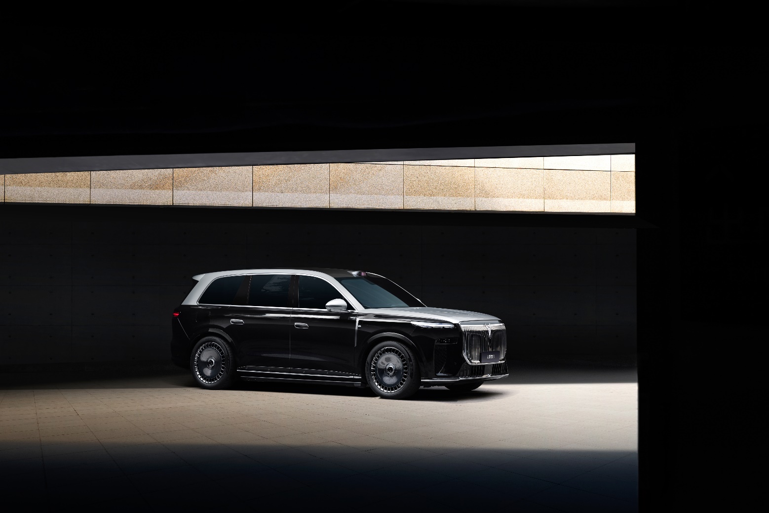 而令其在发运途中便自成焦点的,则是其磅礴气韵与东方美学设计。车身超5.2米、宽超2米,呈现出“山海万壑”般的磅礴体态。前脸34根光瀑华柱格栅与“天地之镜”轮毂,静止时如收纳苍穹,行进时尽显王者姿态。细节处,“日月同辉”大灯、“山海倒影”尾灯,以及门把手上的“流光星辰”点阵,皆在方寸间植入东方意象,向世界宣告:中式豪华,自有其道。