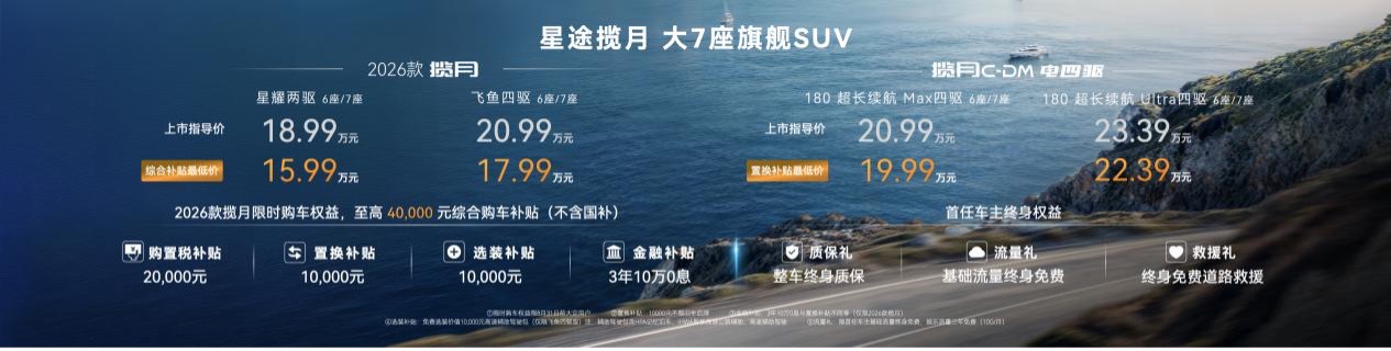 2026 款星途揽月的双十一优惠政策堪称诚意满格,优惠权益覆盖购车、置换、金融、选装四大维度,全面降低用户拥车成本。其中,购置税补贴高达2万元/台,大幅降低购车初期成本;置换补贴1万元/台且不限品牌,让老车主换购更省心;金融补贴提供3年10万0息方案,有效减轻资金压力(与置换补贴不同享);飞鱼四驱版免费选装价值10,000元高速辅助驾驶包(注:辅助驾驶包含HPA记忆泊车、iHWA智能高速公路辅助、高速辅助驾驶),让选购飞鱼四驱版的用户轻松拥有旗舰奢享出行新体验。此外,用户还可享整车终身质保、基础流量终身免费、道路救援终身免费三大终身权益,真正实现“购车无忧、用车无虑”。