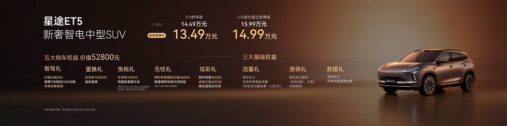 作为本届星途展台的焦点,「新奢智电中型SUV」星途ET5已于11月28日在珠海上市,新车带来210舒享版、210激光雷达智尊版两个款型,官方指导价为14.49万元-15.99万元,超级置换价13.49万元-14.99万元以诚意满满的价格回馈用户,并重磅宣布猎鹰700城区NOA功能终身免费使用。价值52800元五大购车权益、三大基础权益下定即享。