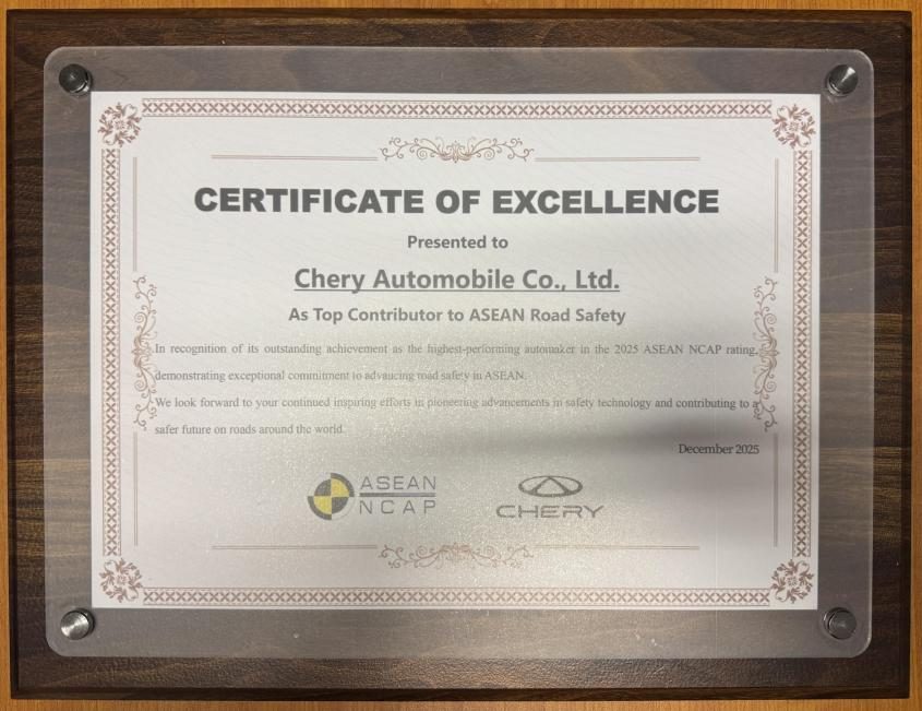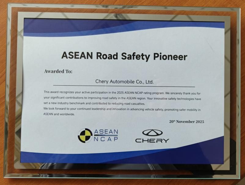 图为ASEAN NCAP官方授予奇瑞汽车“东盟道路安全先锋奖”