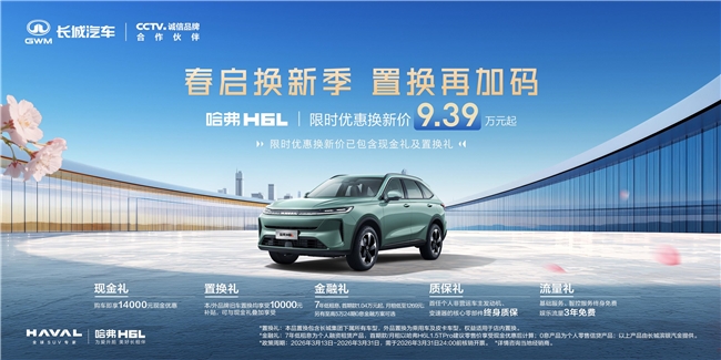 春分将至,万物复苏。对于许多家庭而言,一辆能承载全家出行需求、让旅途更舒适的SUV,正是开启春日旅程的“最佳搭档”。近日,哈弗H6L限时购车政策再加码:3月13日至3月31日,限时优惠换新价低至9.39万元起(已包含现金礼14000元及置换礼10000元)。当诚意十足的购车政策,遇上产品力全面进阶的哈弗H6L,一场关于“换新出发”的春日叙事就此展开。