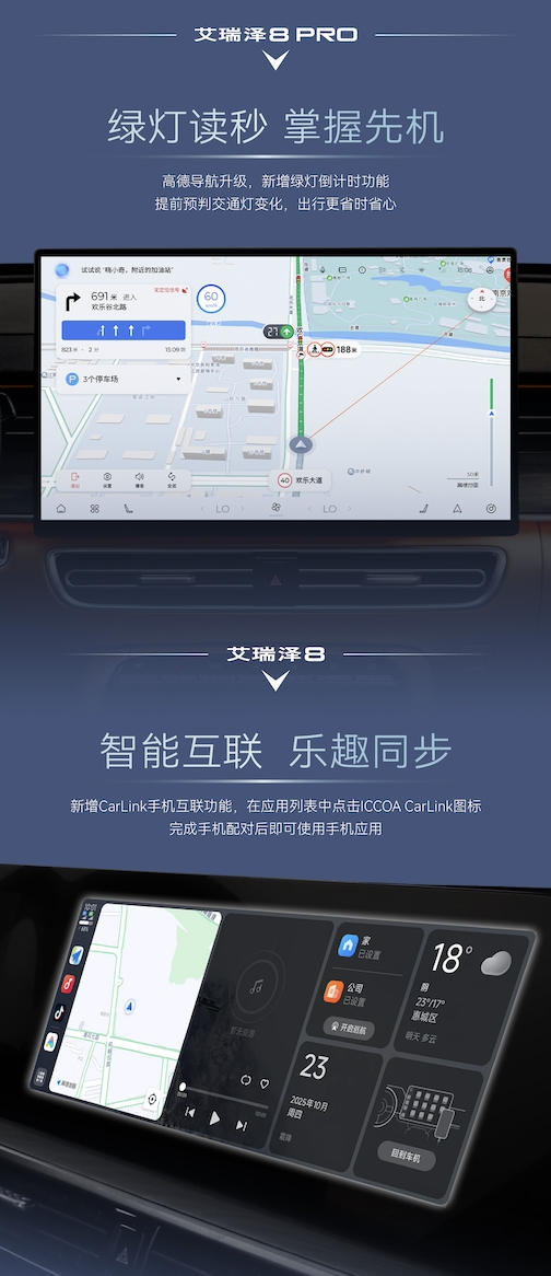 针对不同车型,本次升级还带来专属惊喜:艾瑞泽8 PRO同步升级高德导航系统,新增绿灯倒计时功能,帮助驾驶员提前预判交通灯变化、合理规划起步节奏,有效节省通勤时间、规避闯红灯风险;艾瑞泽8则新增CarLink手机互联功能,用户在完成配对后可在车机便捷使用手机应用,实现车机与手机无缝联动,让智能互联更具乐趣。