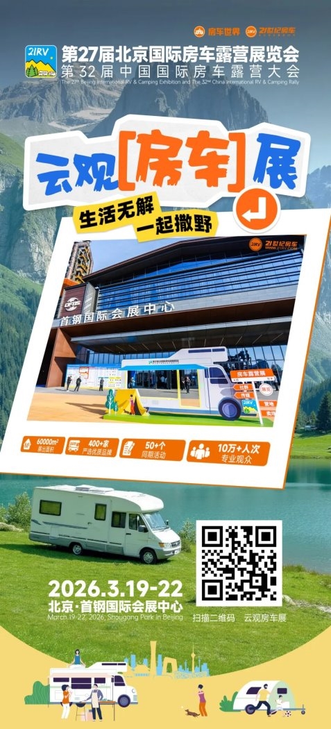 敬请广大观众和行业同仁莅临参观指导,共同见证这一盛况!2026年3月19日-3月22日,第27届北京国际房车露营展览会暨第32届中国国际房车露营大会,北京·首钢国际会展中心,我们不见不散!