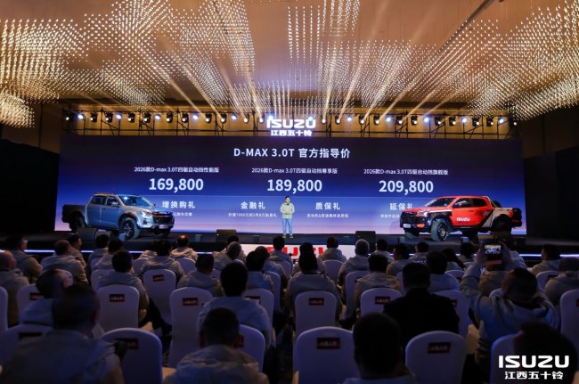 在全场的热切期盼中,发布会迎来最受瞩目的价格揭晓环节。全新D-MAX 3.0T正式公布官方指导价16.98万元起,与此同时,江西五十铃还带来了诚意十足的四重购车好礼,包括价值6000元的增换购礼、价值7000元的2年8万贴息礼、发动机与变速箱终身质保礼,以及排放部件延保至4年8万公里的安心保障,以实实在在的礼遇回馈每一位用户的信赖与支持。