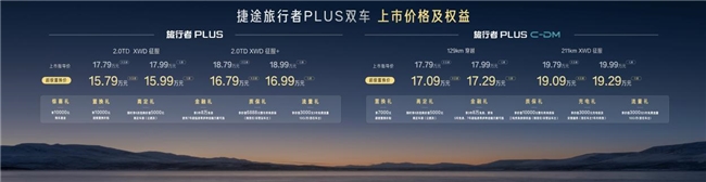 本次上市的捷途旅行者PLUS系列,覆盖“燃油+电混”双动力布局。捷途旅行者PLUS提供2.0TD XWD征服、2.0TD XWD征服+两款配置,官方指导价为17.79万元-18.99万元,超级置换价15.79万元-16.99万元。捷途旅行者PLUS C-DM则推出129km穿越、211km XWD征服两款配置,官方指导价为17.79万元-19.99万元,超级置换价17.09万元-19.29万元。