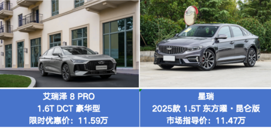 但不管竞争如何加剧,过硬的产品力始终是评判一款车型的核心指标。2025年3月,艾瑞泽8 PRO正式发售,重新定义了A+级家轿的价值标准。而此前,这一级别的常青树车型星瑞,在产品力方面同样极具过人之处。那么,这两款车究竟孰强孰弱?下面我们将以艾瑞泽 8 PRO 1.6T-7DCT 豪华型(以下简称“艾瑞泽 8 PRO”)与星瑞东方曜昆仑版(以下简称“星瑞东方曜”)进行全方位对比,一见二者实力真章。