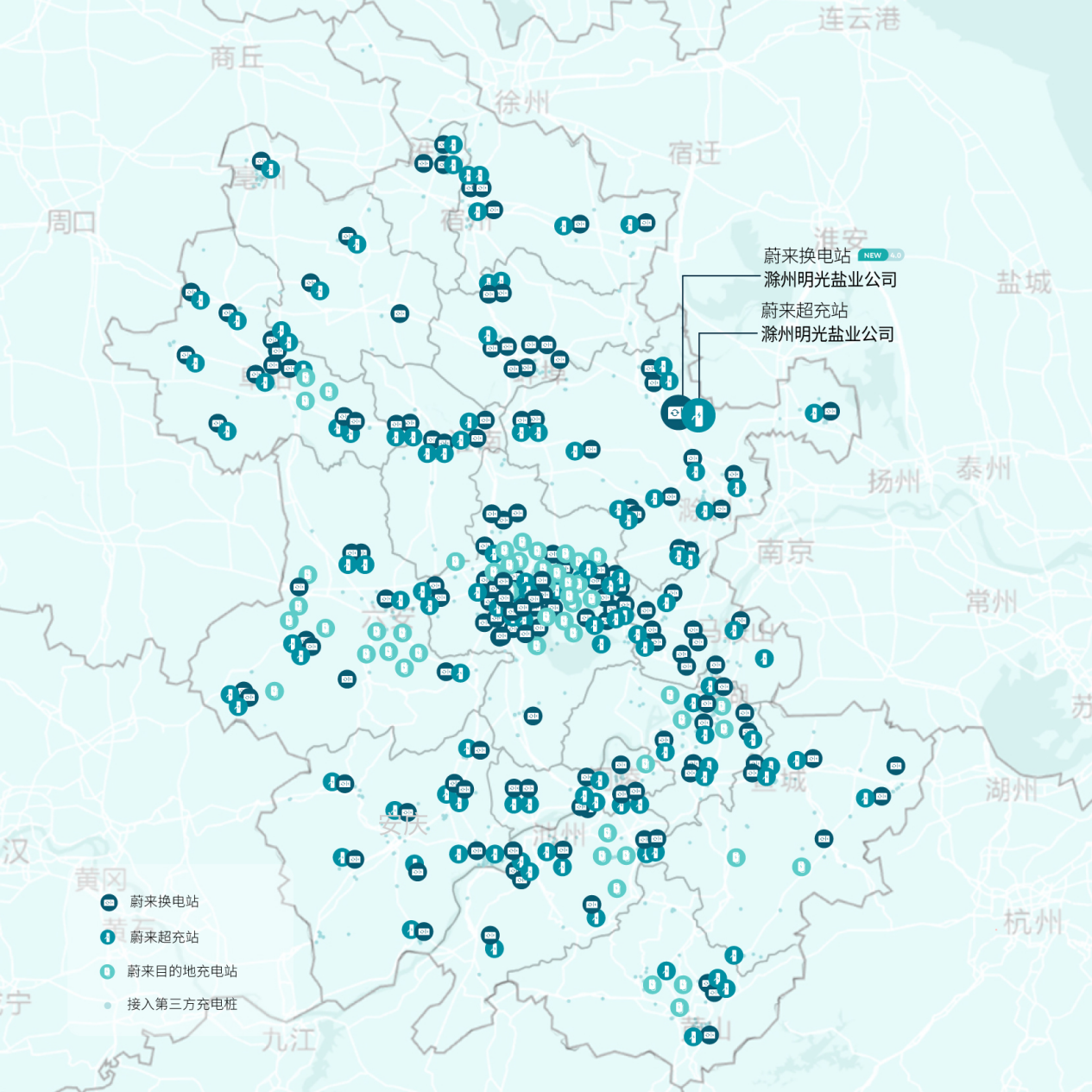 截至今日,蔚来已于安徽建成换电站159座、充电站192座、1,122根,并接入39,568根第三方充电桩。
