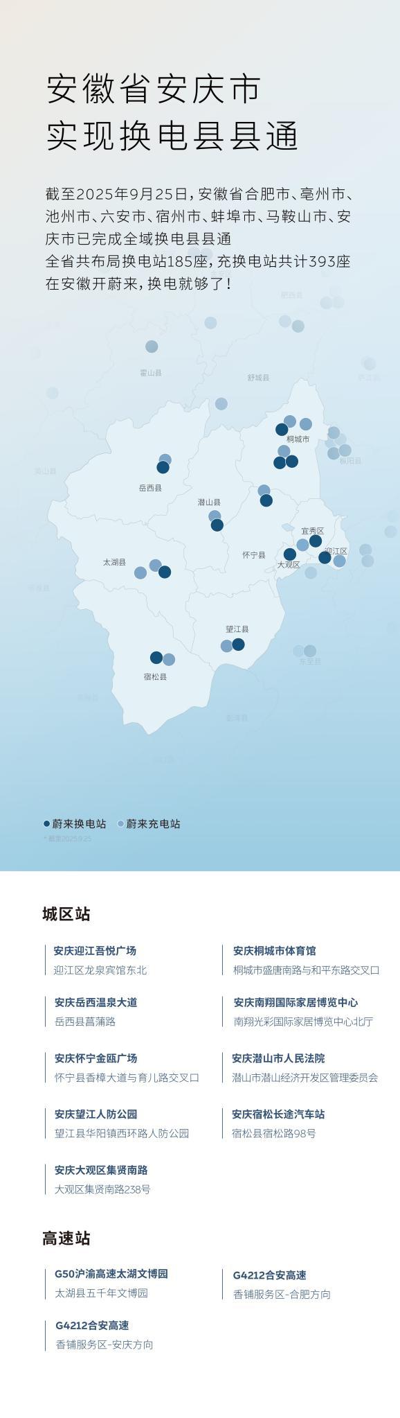 2025年9月25日,安庆大观区与芜湖无为市双站齐发,蔚来换电站 | 安庆大观区集贤南路、蔚来换电站|芜湖无为桥头公园正式上线。