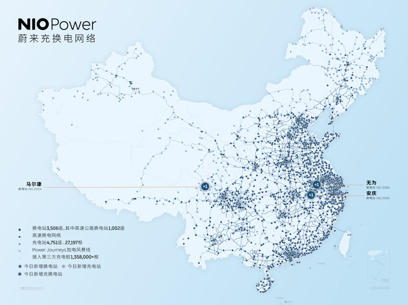自2018年5月20日第一座换电站投入运营以来,截至2025年9月25日,蔚来在全国范围已累计提供换电服务超过8600万次,换电站累计布局数量已达3,506座,其中高速公路换电站1,002座,超充站数量达4,751座,充电桩27,197根,接入第三方充电桩1,358,000+根,为用户提供可充可换可升级的能源服务体验,让加电比加油更方便。