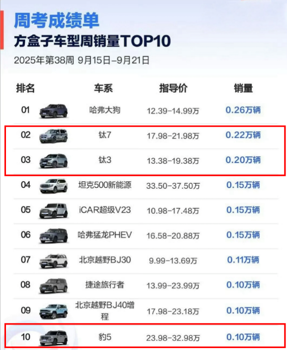 方程豹的成功,在于它用开创性的技术和方盒子的造型解决了人们需求中的“二元对立”。在2025年9月15日至9月21日,方盒子车型周销量TOP10榜单中可以看到,方程豹品牌大放异彩!其中,钛7与钛3两款车型共同冲入榜单前三,分别占据TOP2与TOP3的双宝座,双钛齐飞,实力领跑!与此同时,方程豹的另一款明星车型豹5也跻身周销量TOP10。方程豹品牌共三款车型强势杀入榜单前10,展现了其强大的市场号召力和品牌影响力。在新势力品牌周销量榜中,方程豹品牌更是位列TOP7,成绩斐然。