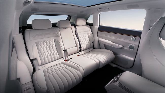 空间也是家庭用户的核心诉求之一,尤其是对于有孩子和老人的家庭,宽敞的乘坐空间和灵活的储物设计至关重要。星纪元ET以其“豪华全景大平层”的设计理念,打造出超越同级的车内空间。其车身尺寸为4955×1975×1698mm,轴距达到3000mm,舱内有效空间达3.45m³,营造出了宽敞舒适的乘坐空间。