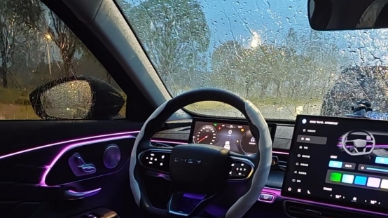 抵达徐闻港时,等待过海的车辆已经排起了三公里的长龙。天空突然乌云密布,倾盆大雨说来就来。看着窗外冒雨跑向洗手间的游客,我们果断决定开启"车内度假模式"。媳妇熟练地打开24.6吋悬浮式双联屏,继续追她的《大如传》。高通骁龙8155芯片让车机流畅得不像话,切换应用毫无卡顿。等待的过程中,我们看着其他车主在雨中狼狈奔跑,媳妇感慨:"感觉我们像是在看一场真人秀。"
