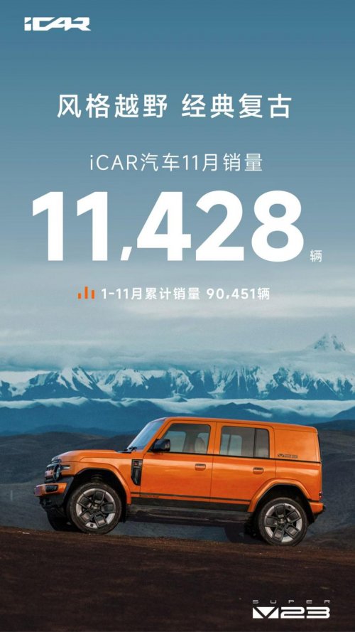 作为奇瑞锚定未来的新能源新势力品牌,iCAR同样以领跑者的姿态,走出一条以特色车战略为核心的长期主义道路。在深耕用户共创、捕捉年轻消费者需求的精准洞察下,iCAR全球粉丝规模突破500万,APP注册用户300万,用户活跃度和口碑持续攀升,11月单月交付11,428辆,1-11月累计销量90,451辆,明星车型V23更持续稳居新能源方盒子SUV细分市场TOP 1,用实打实的市场成绩,证明了其特色车路线已赢得市场的高度认可。