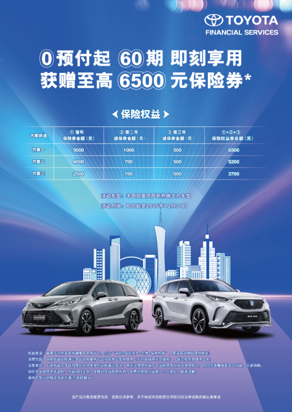 围绕“全程无忧”理念,此次丰田租赁推出的全新产品,整合了用车过程中的诸多关键环节,旨在为用户提供覆盖车辆使用全周期的服务保障。其中的核心亮点之一,是融资租赁方案中所提供的附加保险权益,覆盖几乎所有的丰田及雷克萨斯品牌主力热销车型。相较于其他租赁产品大多只聚焦于满足用户的“资金周转”需求,丰田租赁充分考虑到用户后续用车过程中的保障需求,特别推出包含首年保险及第二、三年续保在内的保险权益计划。用户可根据所选方案享受相应金额的保障支持,至高可获6500元保险抵扣券。此方案可在降低保险支出的同时,提前将车辆的保险进行有效规划。
