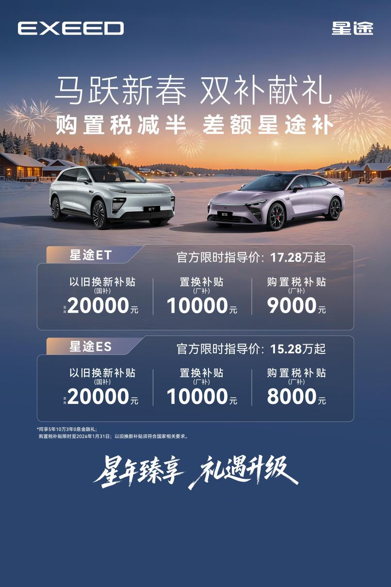 2026年,为激发市场活力、推动汽车产业向绿色与智能化升级,以及减少排放、促进环保,国家“以旧换新”补贴正在持续全面推行,为积极响应国家号召,2026年1月1日起至1月31日,购入星途ET、ES可享至高20000元国补。诚意层层加码,与此同时,星途汽车还为置换用户提供10000元“厂补”,让消费者能够更轻松地享受这两款集成尖端科技与技术的汽车产品。