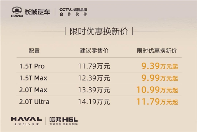 春分将至,万物复苏。对于许多家庭而言,一辆能承载全家出行需求、让旅途更舒适的SUV,正是开启春日旅程的“最佳搭档”。近日,哈弗H6L限时购车政策再加码:3月13日至3月31日,限时优惠换新价低至9.39万元起(已包含现金礼14000元及置换礼10000元)。当诚意十足的购车政策,遇上产品力全面进阶的哈弗H6L,一场关于“换新出发”的春日叙事就此展开。