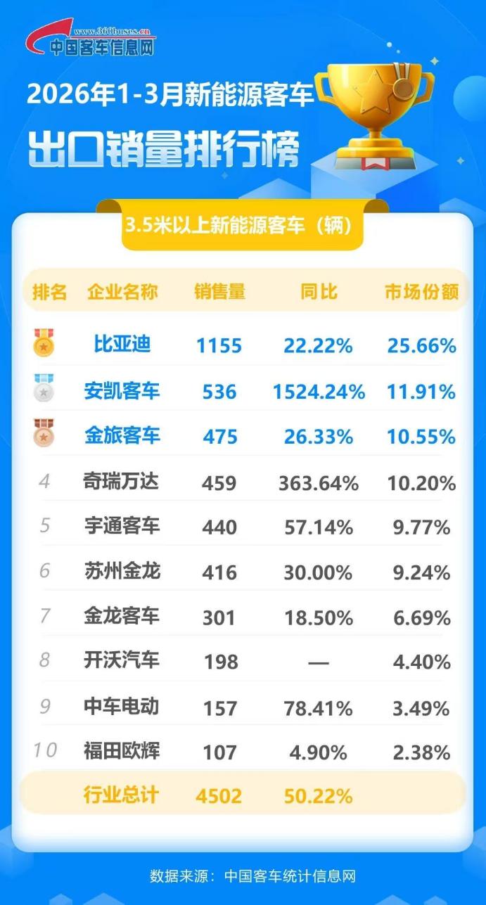 据中国客车信息网数据显示,2026年3月,比亚迪新能源客车出口再次位列第一,同比增速21.52%,高于行业平均水平。至此,一季度,比亚迪新能源客车总出口1155辆,市场份额25.66%,稳居榜首;是行业唯一出口新能源客车超过1000辆的企业,也已连续三年蝉联新能源客车出口冠军,引领全球公共交通绿色变革。