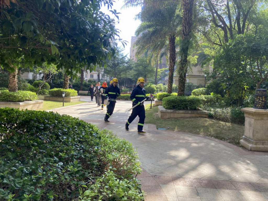 随着一声“火情警报”响起,演练正式启动。模拟火灾现场浓烟弥漫,物业应急小组迅速响应,立即启动应急预案:秩序维护人员快速疏散现场业主,引导大家用湿毛巾捂住口鼻,弯腰低姿沿安全通道有序撤离至小区广场集合点;工程人员迅速切断事发区域电源,排查消防设施运行情况;客服人员则在集合点清点人数,及时安抚业主情绪,整个疏散过程紧张有序。