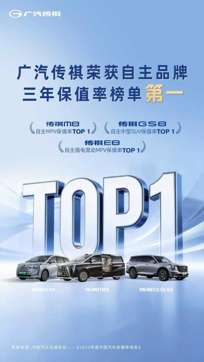 从市场的另一个维度,我们也可以看到消费者对传祺产品品质的认可。根据中汽协最新发布的《2025年度中国汽车保值率报告》显示,广汽传祺以56.82%的三年保值率,连续三年蝉联自主品牌榜首,其中M8、E8、GS8三款主力车型分别登顶各自细分市场保值率榜单,M8更实现连续五年位居中国品牌MPV保值率第一,用实打实的市场数据印证了大厂品质的含金量。